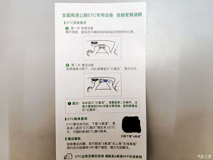 本来想着在银行直接办理一个可以不用等待快递了,没想到问了两家银行之后发现他们现在都不再办理ETC了,让我在银行的APP上直接申请就可以了。由于原来安装ETC的时候根据安装指示下载了E高速APP,打开之后看了看那里面也是可以申请ETC的,所以直接在E高速里面申请了一个ETC,根据界面指示引导,一步步的上传身份证,行车证和车辆照片之后,申请就完成了,上午申请的,下午就显示审批通过,接着就从我们省城济南给我发货了。真的还是很快捷的。如果也有想申请ETC的山东车友,可以试一试这个E高速APP还是不错的。发货之后第二天就收到了快递,打开之后里面一个简单的安装激活说明,一个主机还有一张ETC卡,安装好之后把卡插到主机里激活就可以使用了。趁中午休息的一点时间,抓紧准备安装了,原来是打算用一张废旧的卡片贴到ETC背面,然后再往卡片上贴双面胶安装到挡风玻璃上的,这样不用的时候可以拆卸下来,又不引发防拆柱弹出造成ETC失效,不过经过测试,发现往卡片上贴的3M双面胶不是那么牢固,这样安装的话怕会脱落下来,正好手里还有两块3M泡沫双面胶,就直接把这个胶片贴到ETC安装位置,然后再贴到车内后视镜前面挡风玻璃小黑点的那个位置,不过这样一来OBU的厚度变厚了,不能安装到最中间的位置,那样会影响内后视镜的角度调节,再反复几次寻找位置之后,贴到了小黑点最边缘的位置,这样安装之后,OBU主机在车外是看不到的,但是插上卡之后,卡片有一半是在车外可以看到的,不过也不影响视线和美观,就选择这个位置安装了。