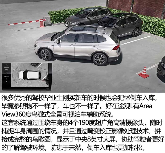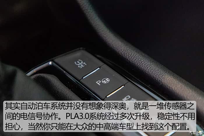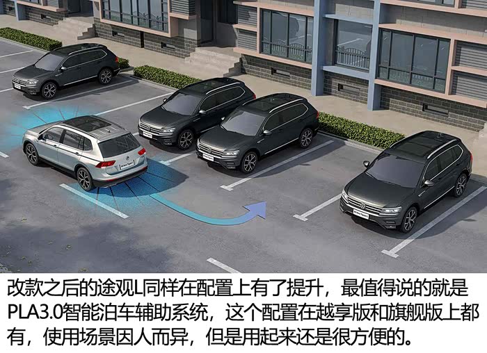 途观L上的PLA3.0智能泊车辅助系统相比此前的2.0版本增加了车头垂直泊车入位的功能,比如在停车场的尽头有一个垂直车位,这个功能就用上了。