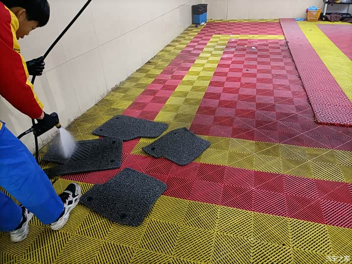 全车残留的水擦干,车内吸尘,脚垫清洗。