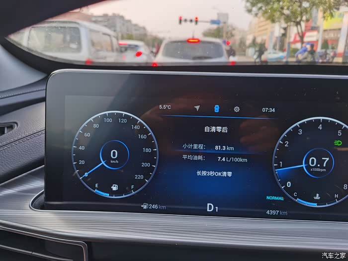 两公里后,油耗降低到7.4,在这种比较好的路况下,基本上每跑两公里多,油耗就会降低0.1左右。