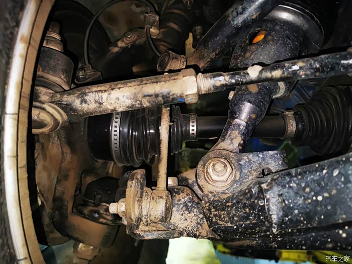 今天的检查非常有必要,因为前桥出了非常大的问题,外球笼套坏了!里边机油全漏了!赶紧订新的给装上了,你看下支臂球头上边那黑色的全是漏出来的油