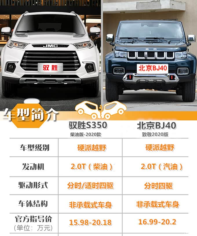 2020款高配的北京BJ40与江铃驭胜S350裸车价相差不大,都是20万内便可入手到的越野车型!不过配置上的差异就有点让人目瞪口呆了。