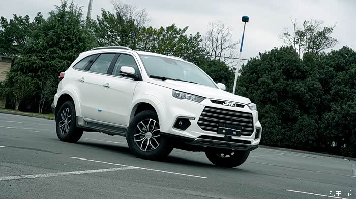 首先从外观来看,新款的驭胜S350给人的感觉更像是台硬派的SUV!犀利的前脸采用了全新样式的进气格栅,刀锋式中网大嘴,上有“JMC”醒目大气的品牌标志,下部分则由多条银色镀铬装饰条组合而成。另外,车身下包围的线条十分硬朗,进一步突出力量感,各种大尺寸的装饰板,让整个车身显得越发“硬派”。q