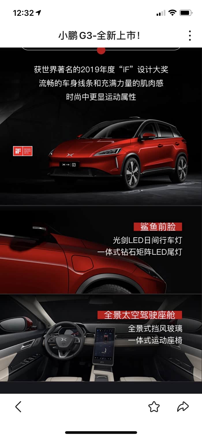 但是再看小鹏g3,鲨鱼前脸,光剑LED日行行车灯,侧身和车尾都是我喜欢的,尤其贴上车模!把棱角分明的感觉体现的淋漓尽致,非常有科技感! 其次就是价格,续航和智能驾驶!为什么放在一起呢?是因为相辅相成,对比起来也方便!