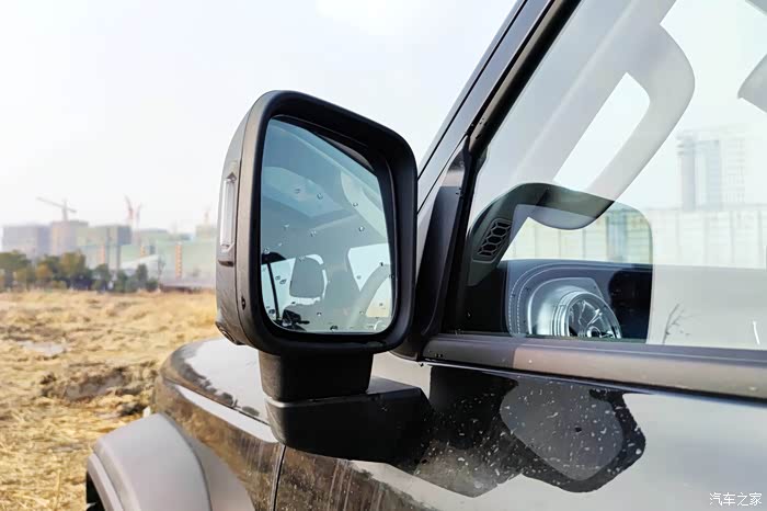 后视镜也是方方正正的,视野不错。