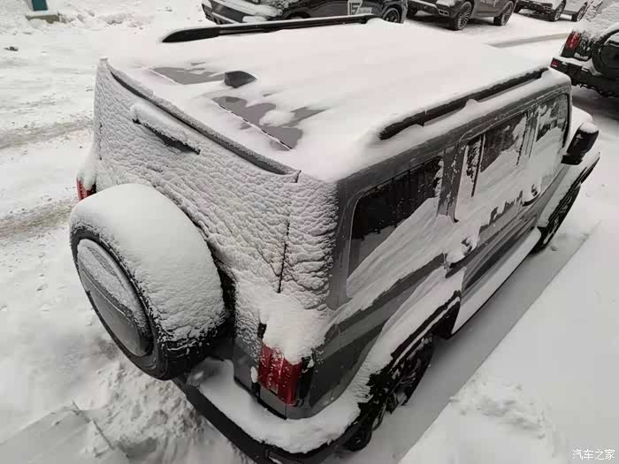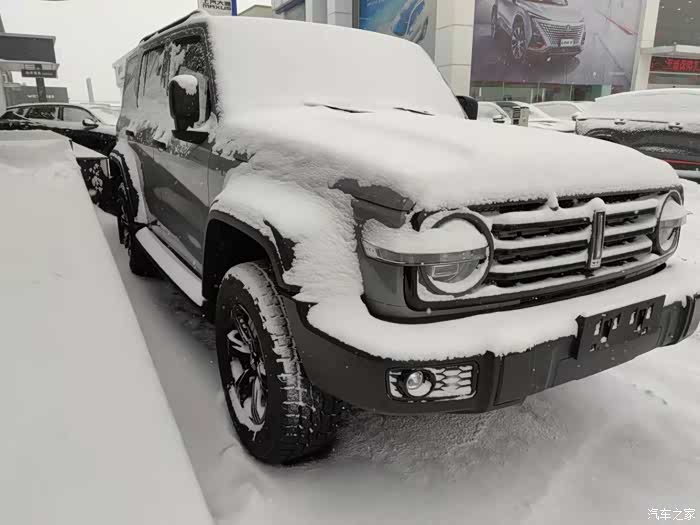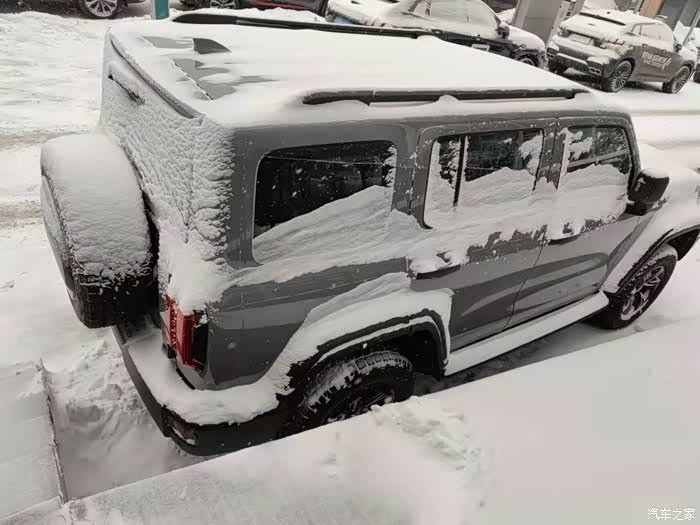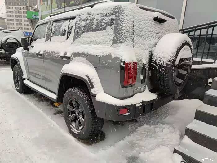 白色的大雪,镶嵌在灰色的坦克300上,是不是很特别!