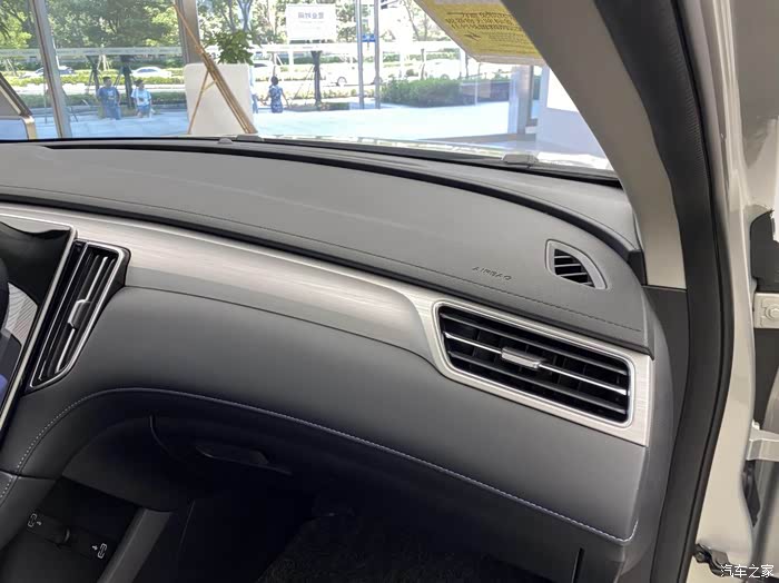 在副驾驶前方的面板上,拉丝的金属质感,并且还有蓝色的缝线,看上去质感很强。