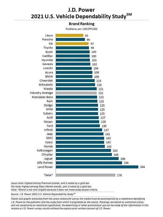 近期,著名的美国市场研究公司J.D.Power公布了2021年度美国汽车市场可靠性报告,也就是下方这张表格。鉴于J.D.Power在业界的知名度和权威性,对汽车行业有着深远的影响,值得我们围绕这份榜单来分析一下。