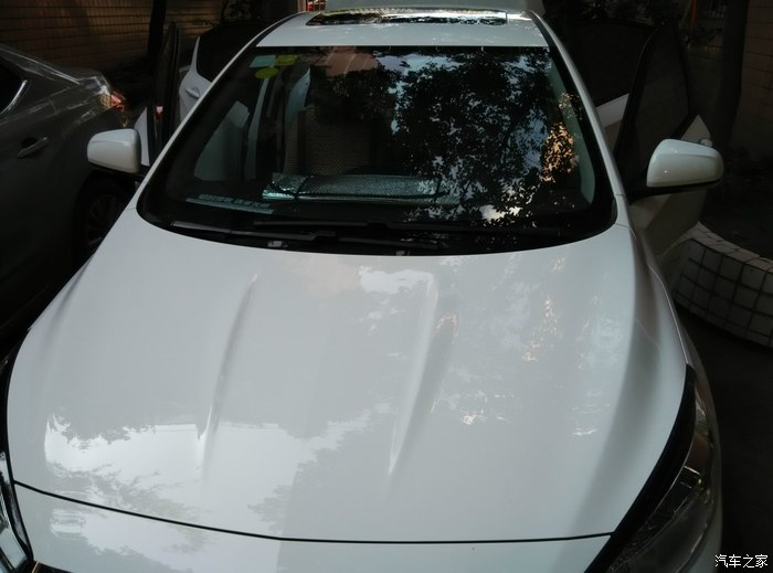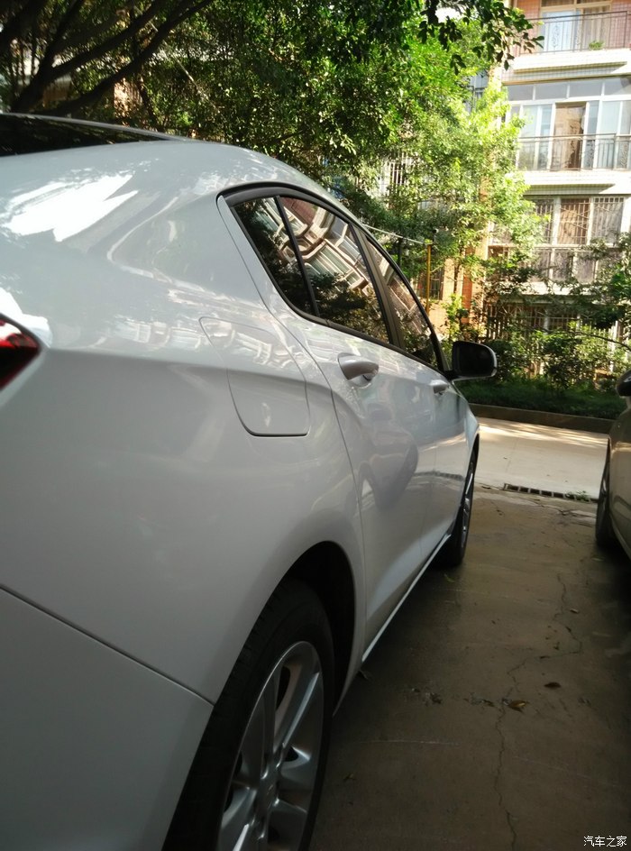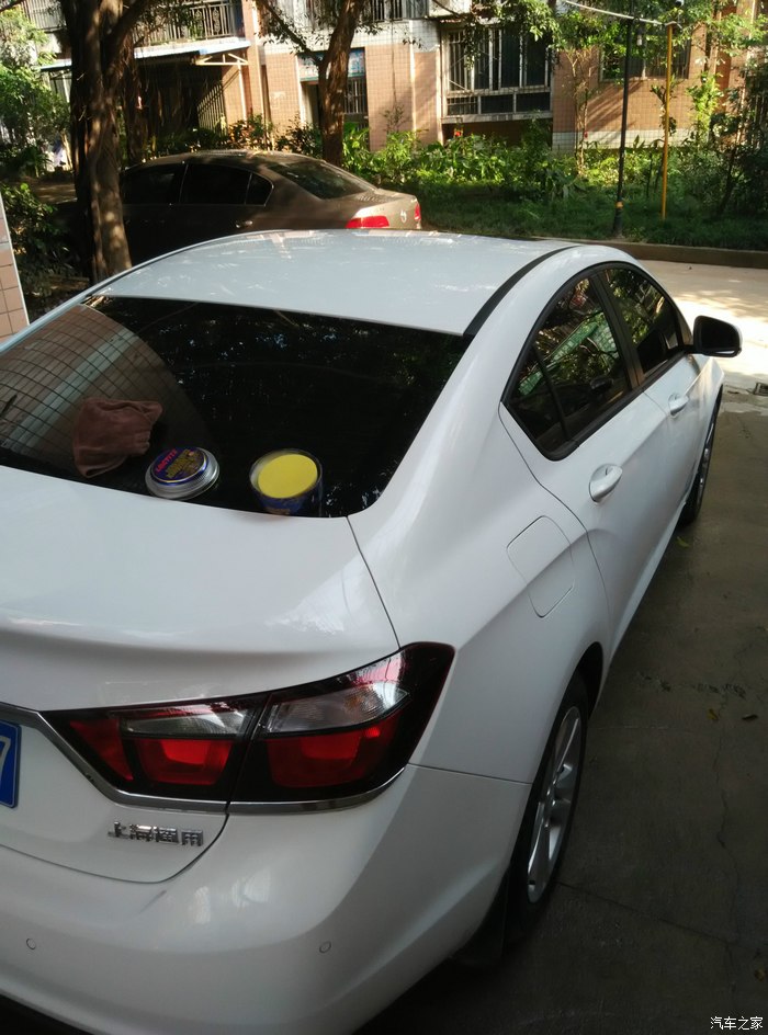 洗车是用的在网上买的洗车器,水压有点小,凑合着用,洗的时候发现车上有几道头发丝一样的划痕,也不知道怎么弄的,而且车门下半部有些小黑点,很难擦掉,得用指甲刮,又怕把车划伤了,还有什么干了的鸟屎,死了的小虫,反正脏得很。足足拉了两箱水,才算洗好了,不过那些小黑点还是有,还请大家说说怎么才好洗掉。擦干净后就是打蜡,用的晶尊镀膜蜡,打蜡的过程在网上看的,先车顶,再车头,然后是两侧和车尾。搞了两个多小时,累死。下面上图,大家凑合着看。