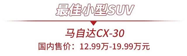 “最佳小型SUV”(国内定义为紧凑型SUV)的殊荣被马自达CX-30夺走,它凭借优秀的操控性能和出色的行驶品质赢得了众多北美地区的信任。值得一提的是,马自达CX-30在北美地区还提供了2.5L压燃发动机,这套动力对于一款小型SUV来说已经绰绰有余。不过在国内,马自达CX-30的吸引力就没有那么强了,它一直处于不温不火的状态。虽然马自达CX-30在国内也提供了2.0L压燃版发动机,但高昂的售价浇灭了国内消费者的购车欲望。