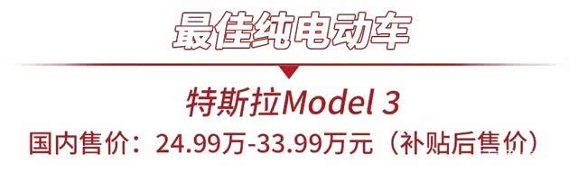 毋庸置疑,特斯拉Model3当选“最佳纯电动车”。得益于马斯克在美国的影响力以及Model3自身的实力,很难有第二款车型能够盖过Model3的风头。而在国内市场上,Model3同样是一款“香饽饽”。随着国产化率的提高,国产特斯拉Model3的价格一降再降,目前国产特斯拉Model3标准续航版车型的价格已经来到了24.99万元,受到了众多消费者的追捧。