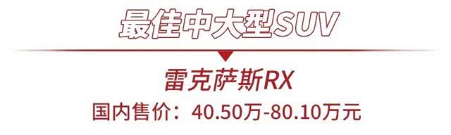 在中大型SUV级别,雷克萨斯RX当选最佳车型。作为北美地区最受欢迎的豪华SUV之一,雷克萨斯RX也多次入选《消费者报告》十佳车型。雷克萨斯RX之所以有这么大的影响力,是因为其安全性、舒适性以及燃油经济性都可圈可点。而雷克萨斯RX除了在北美市场有着良好的口碑,在国内市场也颇受欢迎,并成为雷克萨斯品牌最为畅销的车型之一。