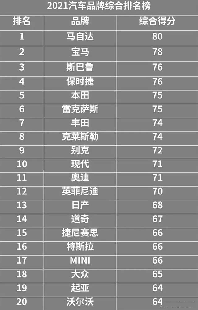 首先最亮眼的当属榜首马自达,其综合得分达到了80分。在国内,马自达有些“叫好不叫座”,其销量与两田一产向来存在较大差距。但大家都知道,马自达车型的设计和操控是强项,并且“技术宅”和“不走寻常路”的形象也让它收获了众多追随者,“马粉”的粘度还是十分高的。