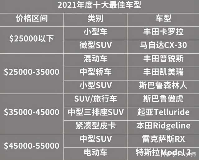 下面我们再来看看《消费者报告》选出的十大最佳车型(注:美国的车型分级与国内有所不同):