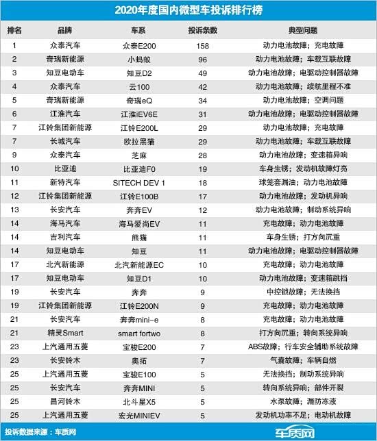 微型车细分市场相对于紧凑型、中大型汽车市场的体量并不算大,因而销量和投诉量的绝对值上也不会很高。所以,2020年度车质网的投诉排行中,投诉量过百的车型仅有一款,那就是众泰E200,而其投诉问题则主要为动力电池故障、充电故障。不过这款车型目前已经停售,而众泰也因经营不善面临诸多问题,车主恐面临投诉难、维权难的窘境。