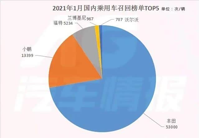 如下表所示,在刚刚过去的2021年1月份,国家市场监督管理总局缺陷产品管理中心发布的召回公告中,丰田召回总数达到了惊人的53000台,占比高达71.8%,毫无悬念的位列召回榜首,遥遥领先其他品牌。