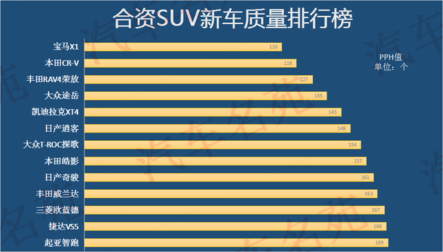 最后,来了解下榜单中PPH值小于140个的合资SUV,分别是宝马X1、本田CR-V、丰田RAV4荣放和大众途岳(1-4名)。宝马X1是2020年最畅销的豪华紧凑型SUV,而宝马X1除了品质比较领先之外,它在质量把控方面,也是做得非常出色。本田CR-V屈居第二位,还是比较令人惋惜的,毕竟本田CR-V是目前最受欢迎的合资SUV,它的市场表现十分出色。而丰田RAV4荣放排名第三,大众途岳排名第四,两大合资SUV也都是当前主流车型,它们有着很不错的市场表现,整体口碑也是较为领先。