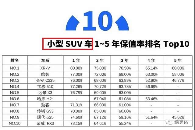 上榜的十款车型当中,国产车占到了6款,这一点还是挺令人意外的,而且长安CS35、宝骏510和远景X3都排名前五,而哈弗H2S、传祺GS3和荣威RX3的保值率也都在55%以上。合资车仅有4款车型入榜,分别是排名前二的本田XR-V和本田缤智,以及排名第七位的日产劲客和排名第九位的现代ix25。