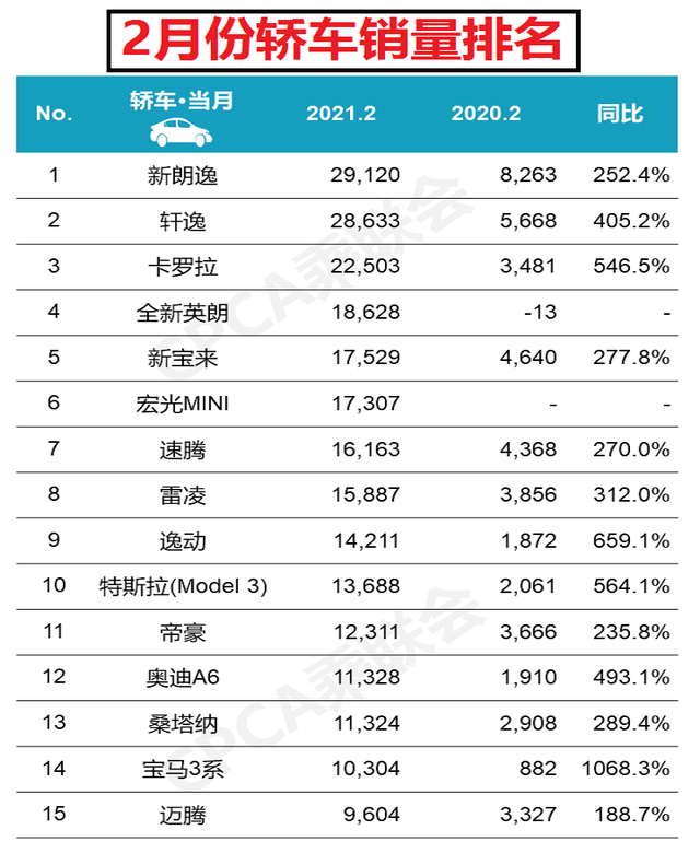 最后,根据2月份轿车车型最新销量排名来看,环比1月份来说,还是比较惨淡的,上榜的15款车型,都未能突破3万辆大关。而大众朗逸重回榜首,长安逸动入榜前十,特斯拉Model3依然大卖,也都是挺令人意外的。