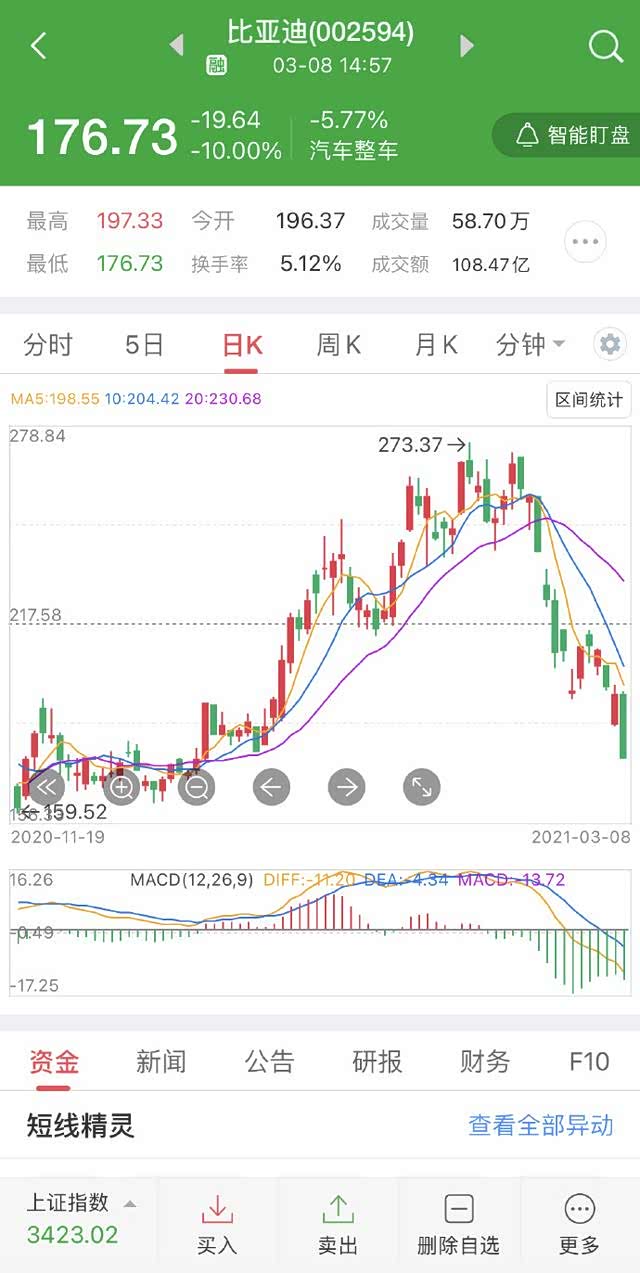 当然2020年传统车企市值涨幅最大,一度超越奔驰的比亚迪,在市值层面也遭遇到了重大重大挫折。3月8日下午,比亚迪的股价彻底跌停,股价从最高点的273.37元,跌到了收盘价的176.73元,市值蒸发了2765亿元人民币。