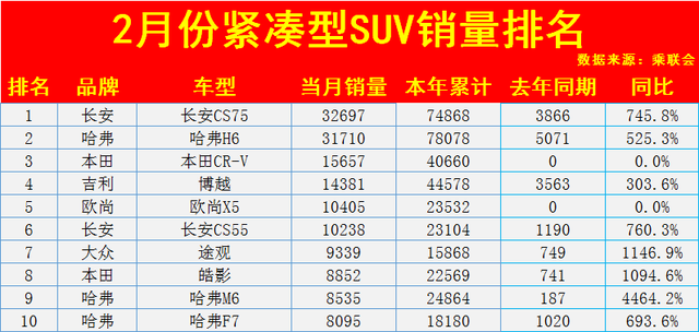 1、紧凑型SUV最新销量排名(2月份)1-10名