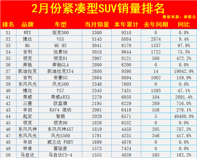 3、紧凑型SUV最新销量排名(2月份)31-50名