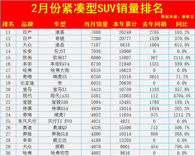 2月份紧凑型SUV销量排名(1-50名)出炉:仅6款破万,皓影前十!