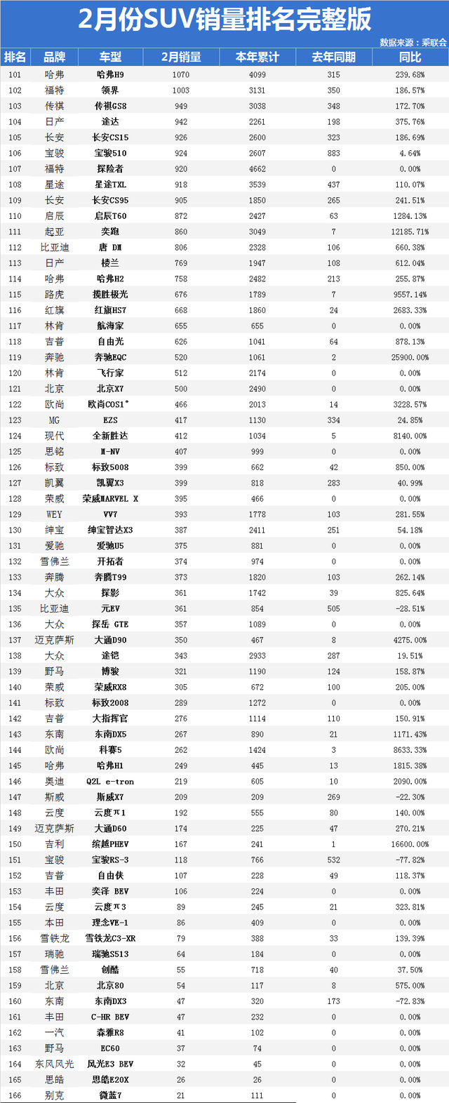 5、最后是2月份销量排名101-166位的SUV车型