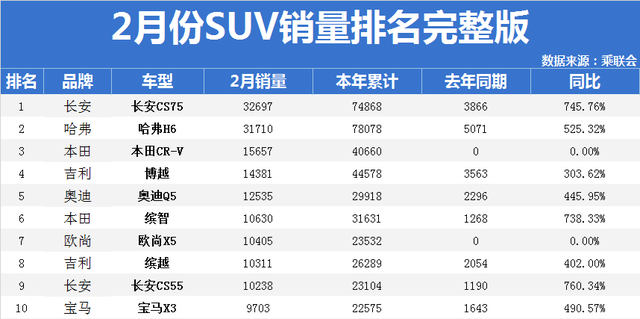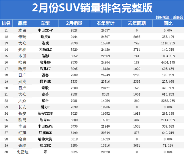 官宣!2月份SUV销量(完整版)排名出炉:1-166名,仅9款车型破万!