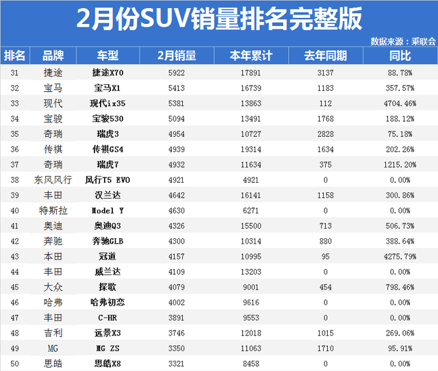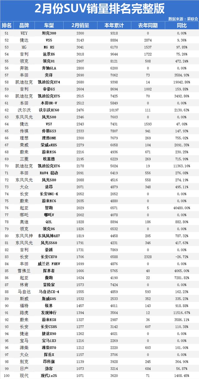 4、然后是2月份销量排名51-100位的SUV车型