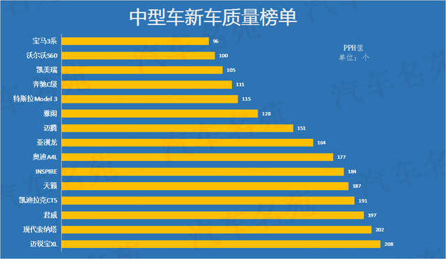 结合整个中型车新车质量榜单来看,整体表现还是比较令人满意的,比如宝马3系的夺冠,沃尔沃S60、丰田凯美瑞、奔驰C级和特斯拉Model3的入榜前五,都是在大家意料之中的。不过本田雅阁仅排名第六,大众迈腾排名垫底,国产车再次遭遇全部落榜,还是令人比较担心的。