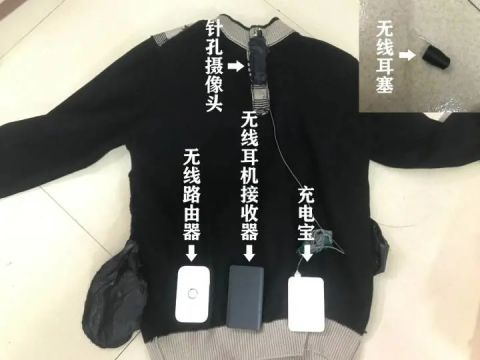 这可不是一件普通黑色毛衣,衣服里面大有乾坤,不光有路由器、充电宝,还有耳机接收器、无线耳塞、摄像头等仪器。这些仪器全用电线连了起来,装在毛衣里。