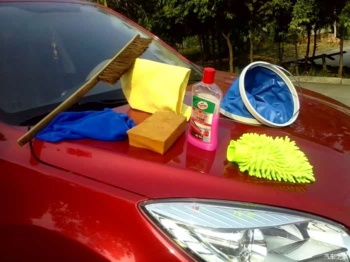 洗车的工具非常简单,高压水龙头,要实在不行,只要有压力,也都可以洗的,然后盆,毛巾最少2张,洗车剂,也可以用洗衣粉或者洗洁精等等,加上一把小刷子,用来刷掉一些树叶等等,最重要的,就是水拉,准备好了以后,就可以开上进行洗车了!