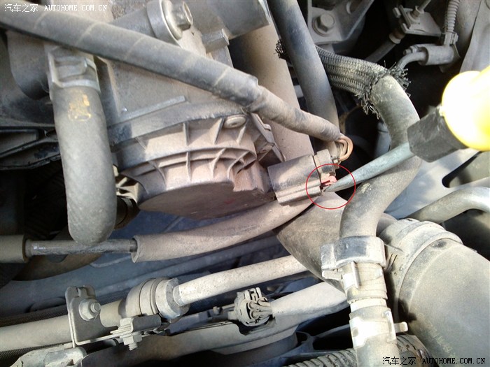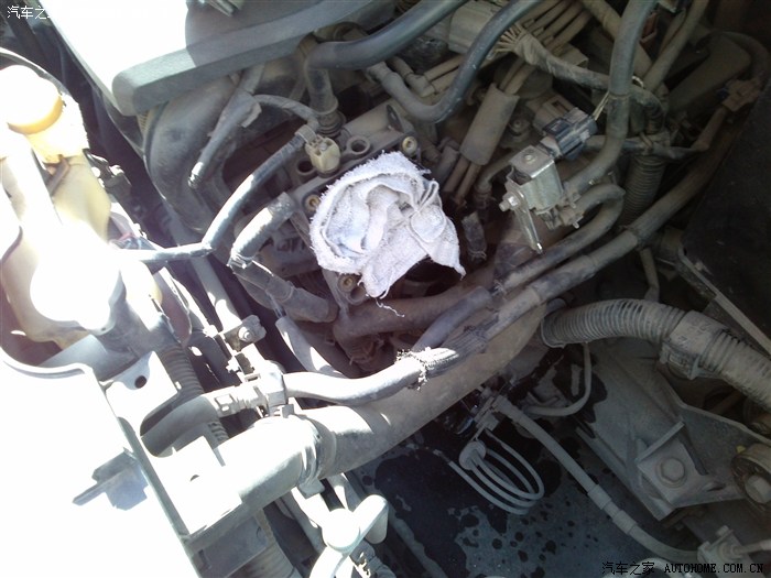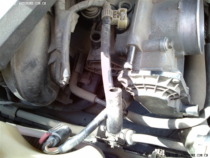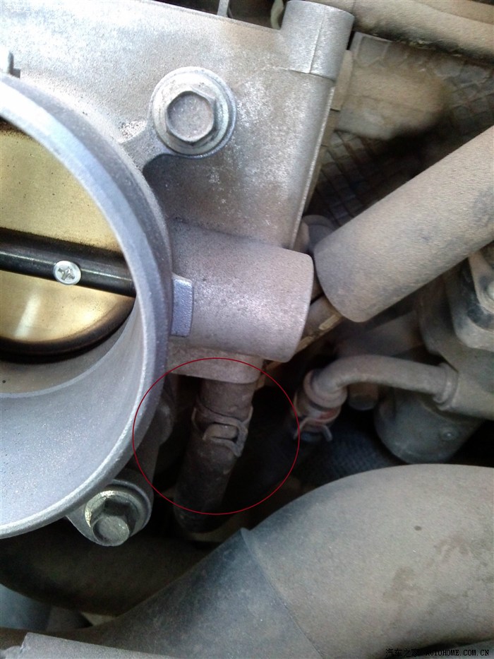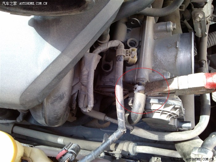 8、用钳子拔下节气门上下两端的胶管 注意最好是凉车的时候拔 不然会有热的防冻液喷出来 能烫到人