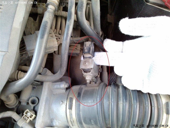 7、拔下节气门电脑传感器的插头 注意红色夹子要轻轻扳