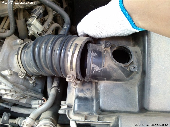 6、拔下空气滤的盒子总成 为什么要都拆来来呢 因为节气门靠下面的一螺丝角度问题 不拆空气滤盒子T型钣手拧的时候角度不好 非常费力