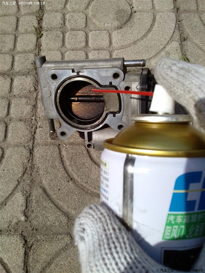 10、用化油器清洗剂喷两侧脏的翻板 注意一定不要用碰翻板的任何部位 以免影响节气门开合角度