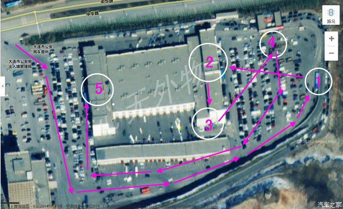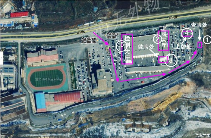 各个地点的办理事项,粉色箭头表示开车到达查验处的路线