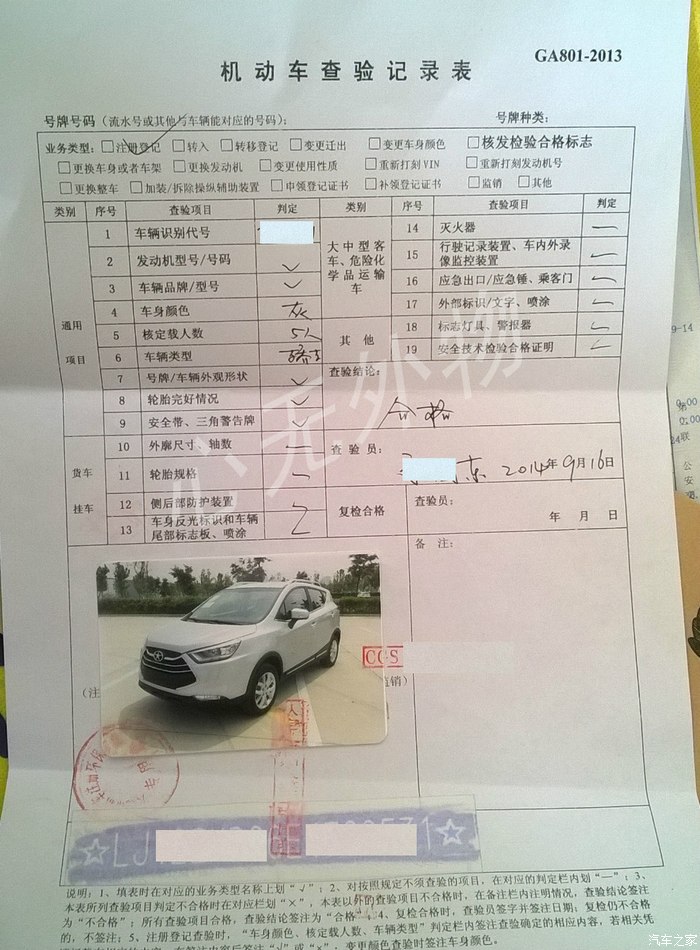 然后在桌子上拿一张车辆查验表。贴上一张车的照片和车辆识别码的拓号。(拓号的纸可以提前剪裁一下,只留下有数字代码的一部分)