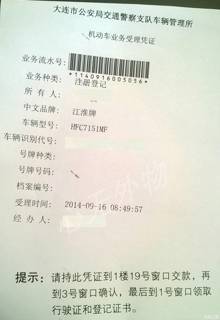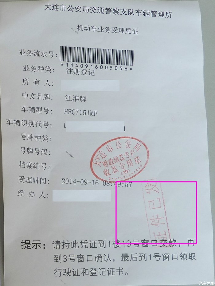 拿着盖好章的受理单,先到3号窗口确认一下,然后在1号窗口等着领取行驶证和登记证书。