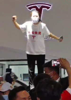 据现场目击者透露,参与维权的车主共有5位,其中一名女子行为过激,爬上车顶,并大喊:“特斯拉刹车失灵”。