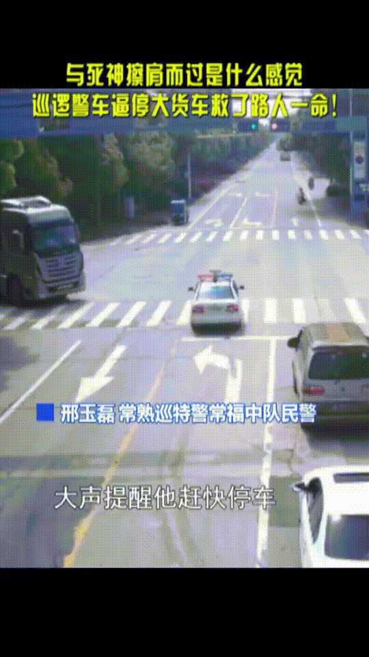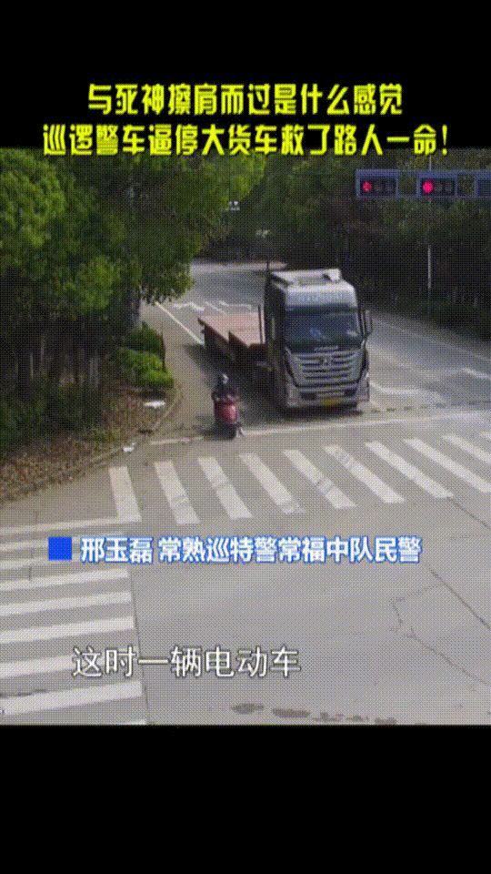 4月13日,在苏州的一个路口,一辆警车紧急逼停了一辆半挂式货车。原来,这辆货车在路口停车后,一辆电动车就停在其右后方。突然,货车起步右转,直接将电动车驾驶员蹭倒。千钧一发之际,正在巡逻的民警邢玉磊和同事开着警车冲过去,果断将货车逼停,救了电动车驾驶员一命。