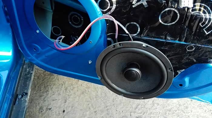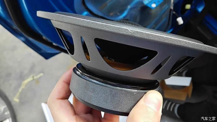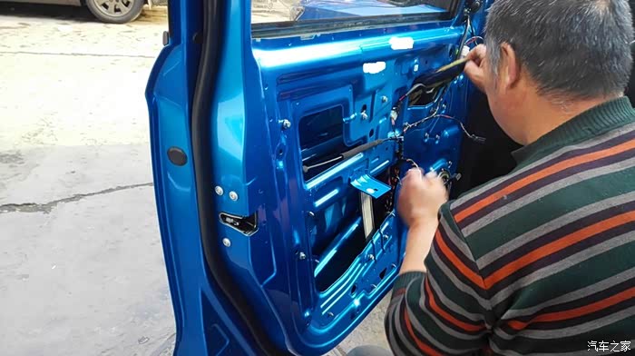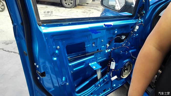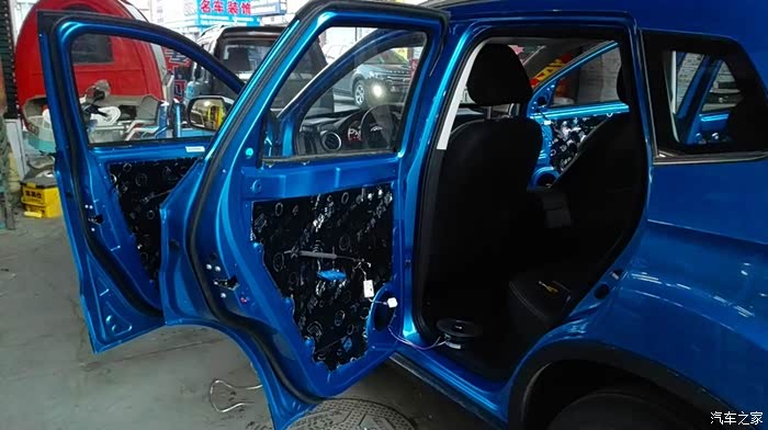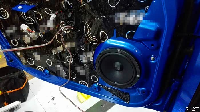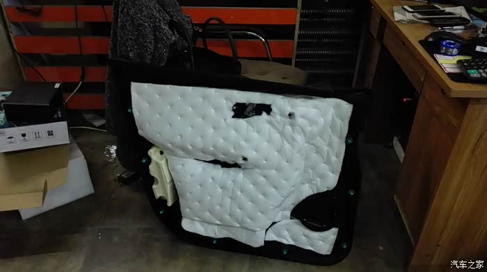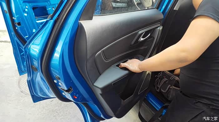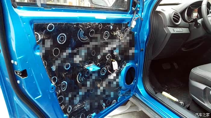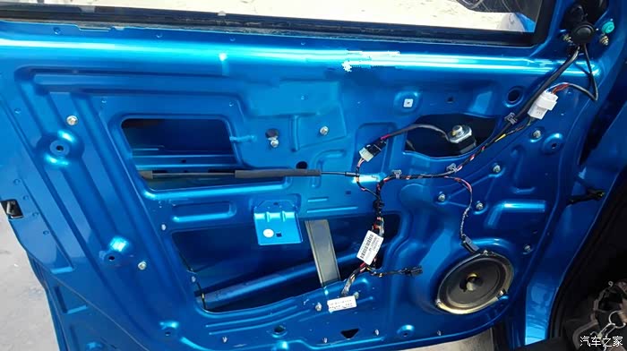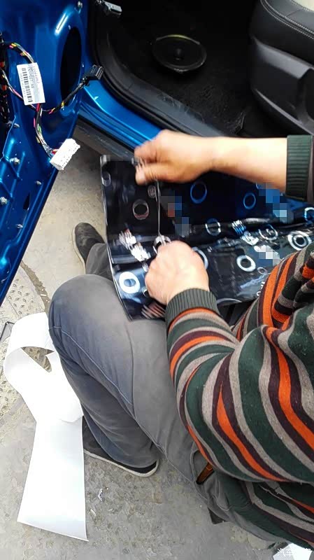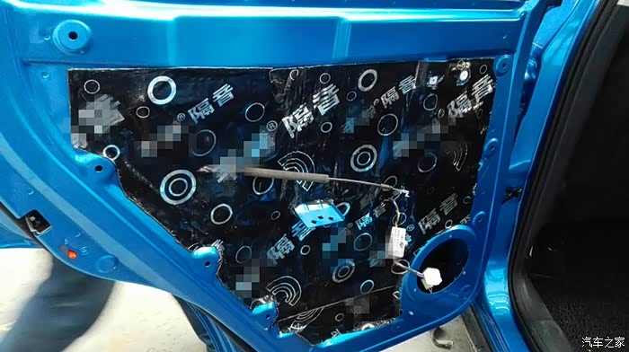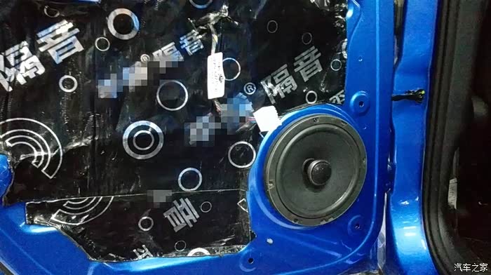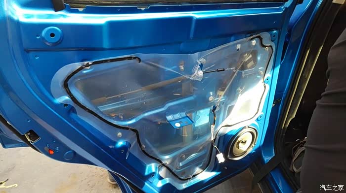 按照上面的方案,依次处理其他三个车门。隔音处理是个慢活,尤其最外面的那一层,要小心处理。这是左后门完工之后的照片。右侧也是同样的方法。隔音处理完毕之后,现在要进行的,就是换扬声器了。自动豪华款,原车自带6个扬声器,前门是单门两个,后门是单门一个。