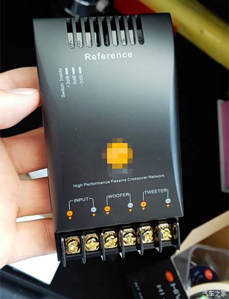 这是用于前门的分频器,具体效果呢,就是把输入的声音新号,分成高、中、低三部分,然后分别输送给高、中、低音扬声器,让它们各自发挥最好的效果。我买的是二分频的,就是只分成两路,分别输送给两路扬声器。