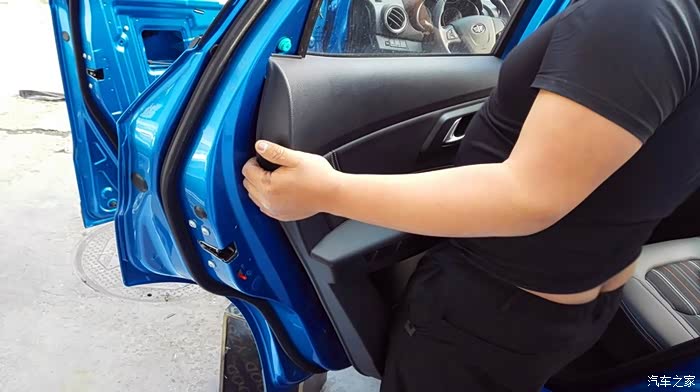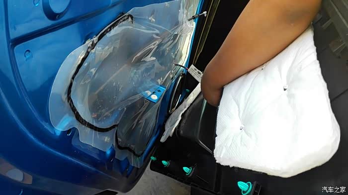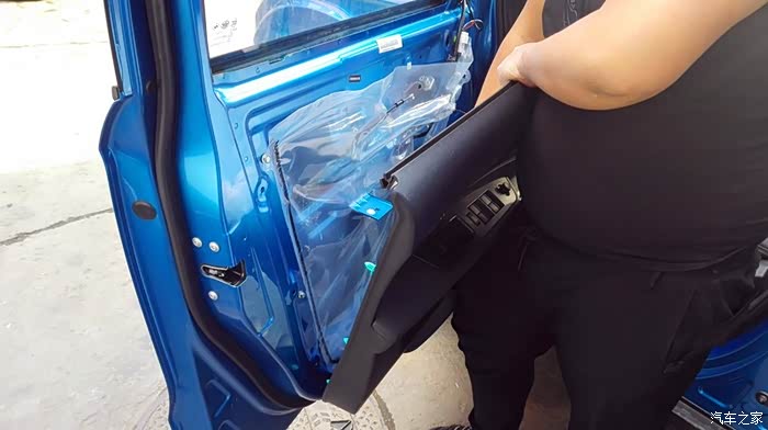 左后门,这个塑料膜直接撕下扔掉。左侧的两个车门板拆卸完成之后,接着拆右侧的,方法和左侧一样的,不多述。 拆完四个门板之后,下面是非常重要的一个步骤,隔音处理。