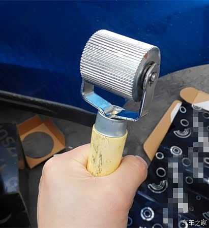 猜猜看这个是什么?没错,是用来滚压的一个工具,隔音脚垫不是粘在门板上就OK了,需要用这个工具滚压的,滚压得越贴好,效果越好。