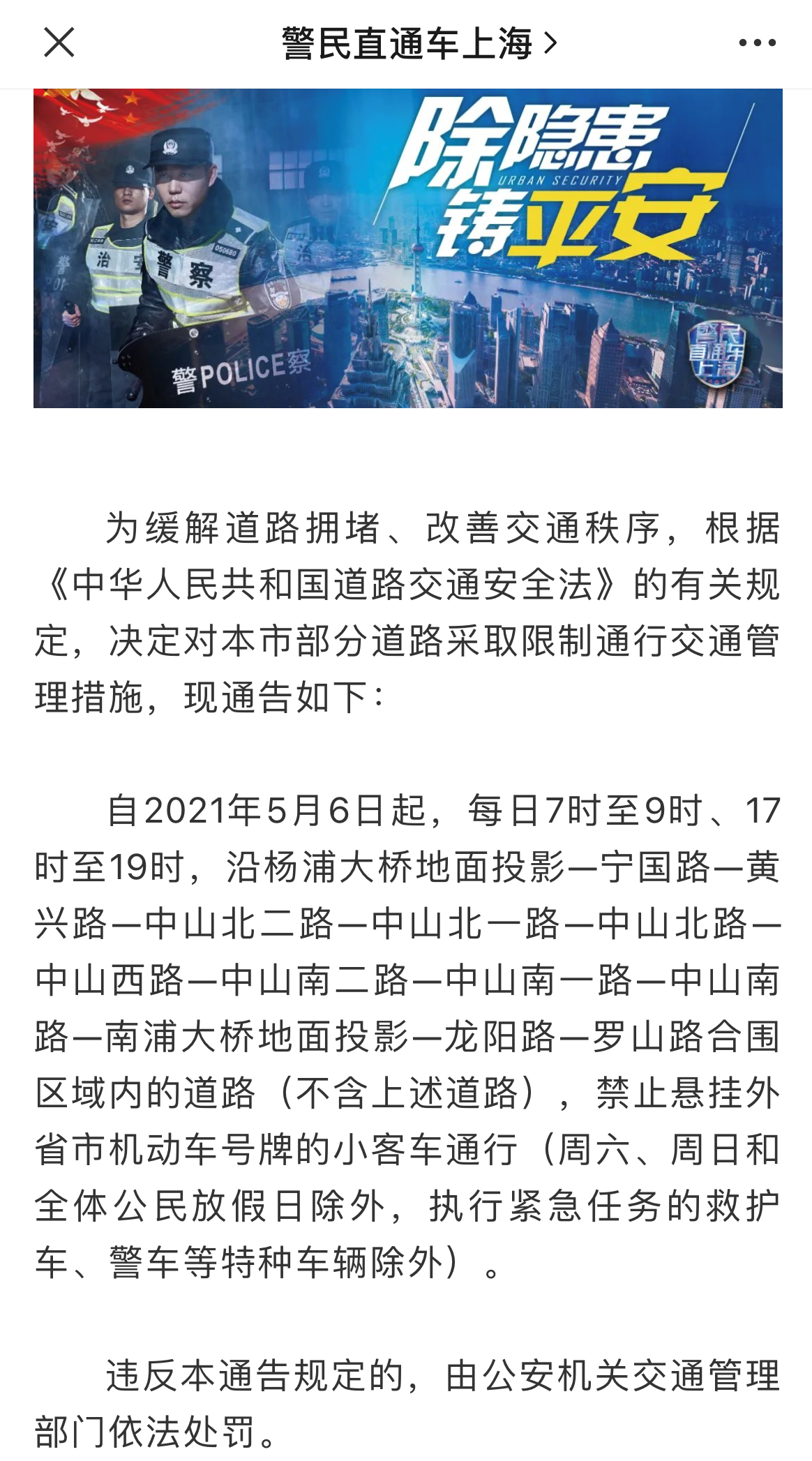 自2021年5月6日起,每日7时至9时、17时至19时,沿杨浦大桥地面投影—宁国路—黄兴路—中山北二路—中山北一路—中山北路—中山西路—中山南二路—中山南一路—中山南路—南浦大桥地面投影—龙阳路—罗山路合围区域内的道路(不含上述道路),禁止悬挂外省市机动车号牌的小客车通行(周六、周日和全体公民放假日除外,执行紧急任务的救护车、警车等特种车辆除外)。违反本通告规定的,由公安机关交通管理部门依法处罚。