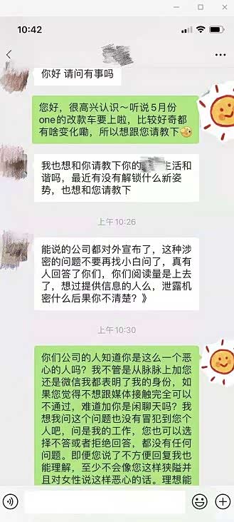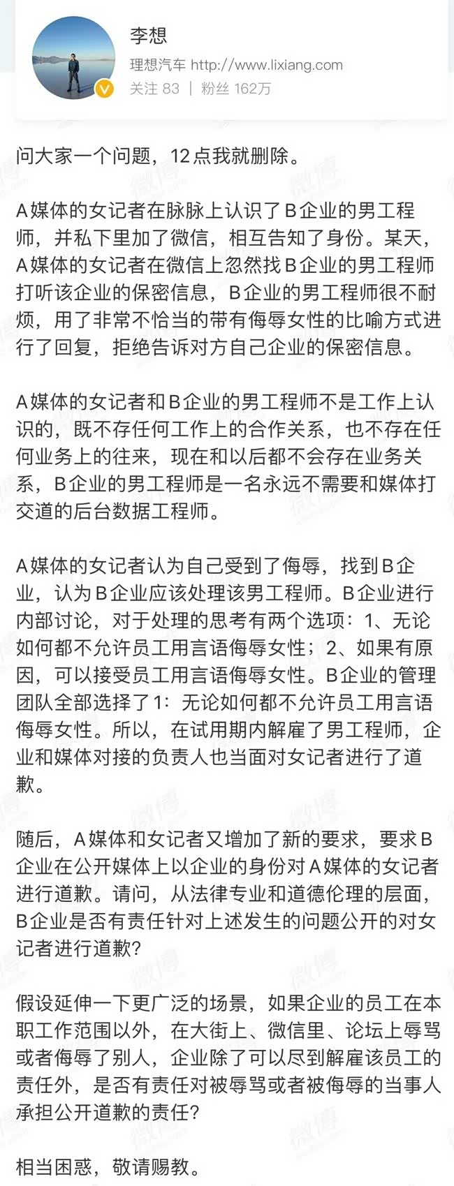李想在前文中提到过,该男性工程师属于“一位永远不会面对媒体的后台数据工程师”,也有可能是遇上了“钢铁直男”,不按套路出牌,该工程师竟用带有侮辱性质的语言嘲讽一番之后,可能是意识到有不妥,随后补充解释道:“能说的公司都对外宣布了,这种涉密的问题不要再找小白问了……你们阅读量是上去了,想过提供信息的人么……?”,但只图一时口舌之快之后,为时已晚。