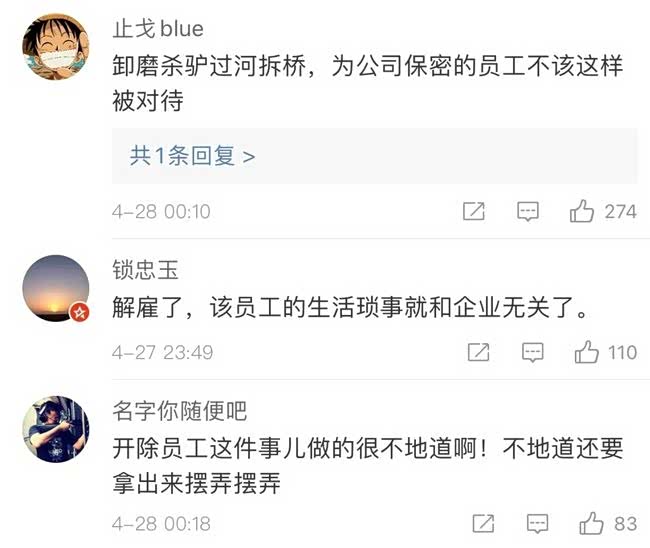 还有很多网友评论称,打听公司机密本身就过分,被骂了也是活该;有人称这属于个人行为,与公司无关,不用开除也无需道歉。