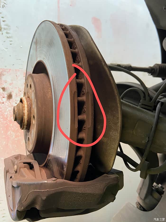 刹车盘通常用12~15万公里没有问题,刹车盘最多可以光盘2次,用3副刹车片。划红圈的地方是刹车盘的平衡切口。